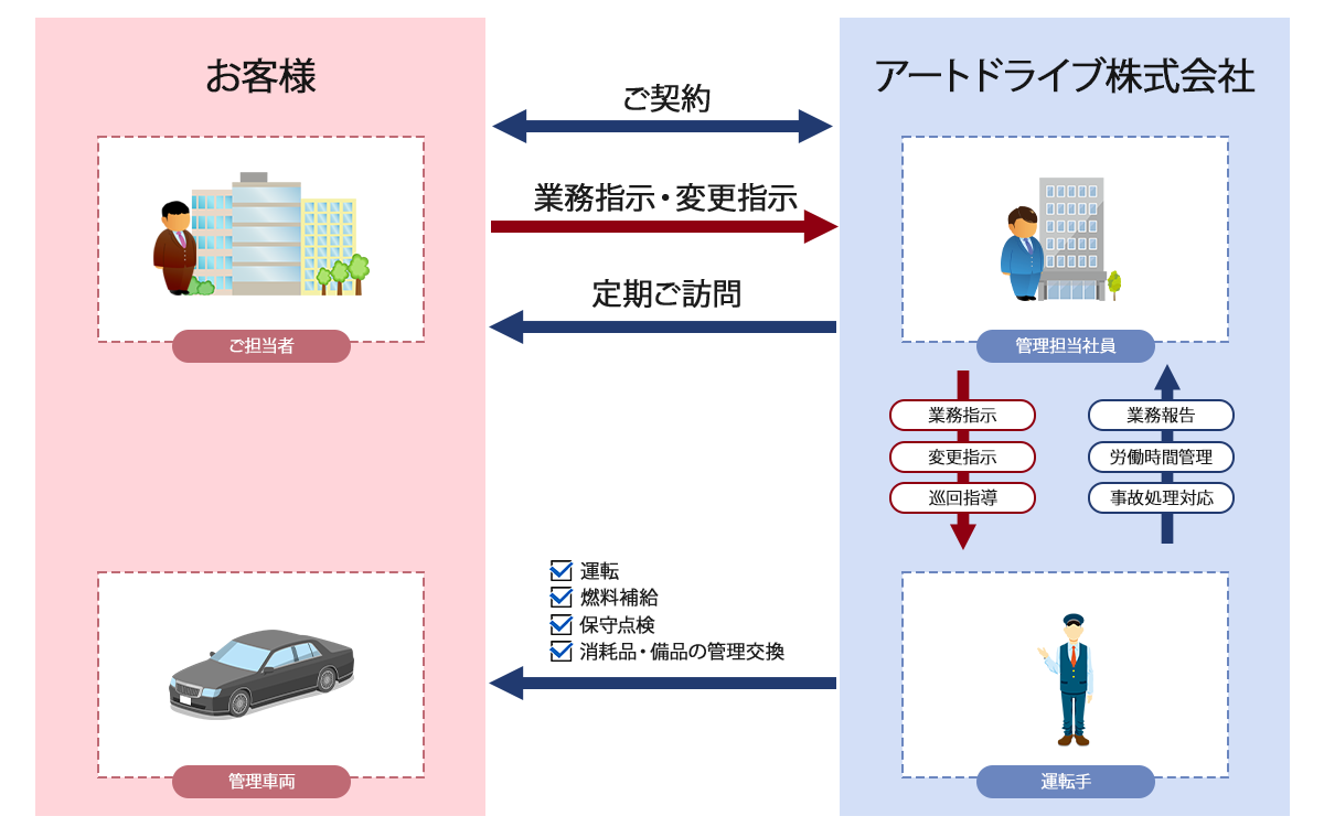 アートドライブ株式会社では、請負契約に基づき、自動車の運転業務と車両管理を一体的に請け負っております。